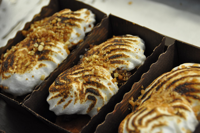 Si bien qu’en boutique il n’y a que des croustades ou des biscuits maison (tresses, chaussons…) dont le fameux Mas d’Azilien, un biscuit à la cuillère et une meringue parfumée à l’alcool de figue fait maison, des morceaux de figues confites, le tout flambé au chalumeau»