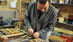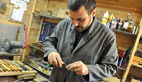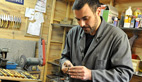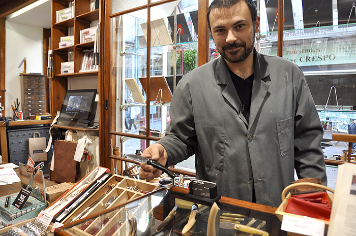 Olivier réalise le montage de tous ses couteaux en série dans l'atelier qu'il a installé derrière la boutique, place du Marché au Beurre, un atelier ouvert sur la ville ou l'on peut le voir travailler. Car ici pas de tromperie, on ne fait pas sous-traiter les couteaux au Portugal ou en Asie du Sud-est, c'est du local.