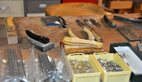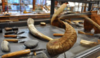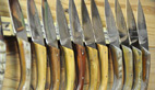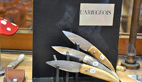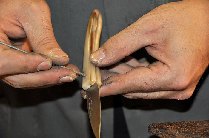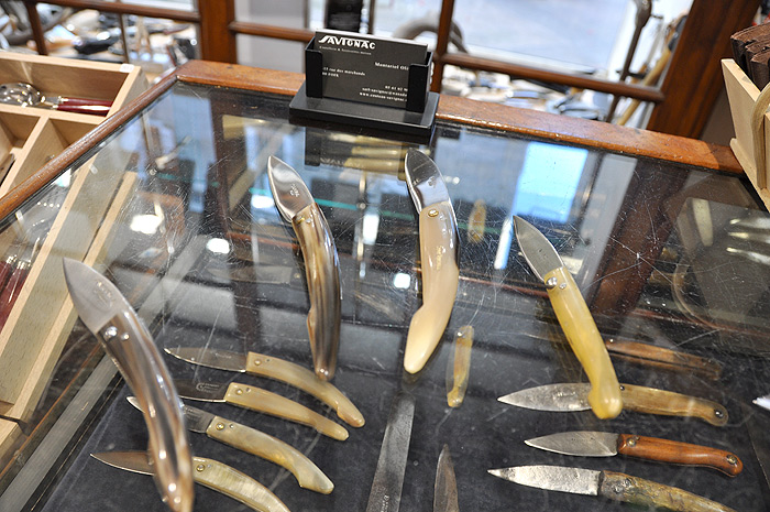 Corne noire, corne blonde, corne de bélier, bois de cerfs, la aussi plusieurs gammes de manches. «Nous tavaillons sur des pointes de cornes qui viennent de Thiers tout comme les lames en acier traditionnel, elles sont ajustées, aiguisées et ciselées ici en atelier et pour le damas, je travaille exclusivement avec Eric Boisset, installé dans la Barguillère»