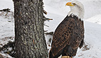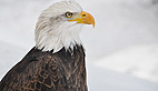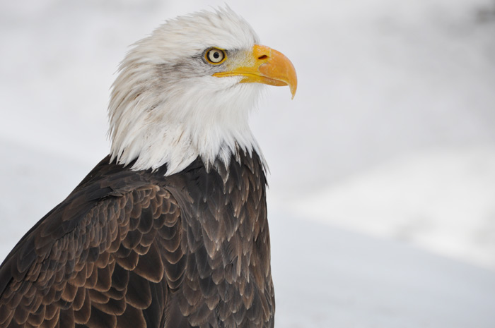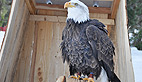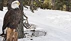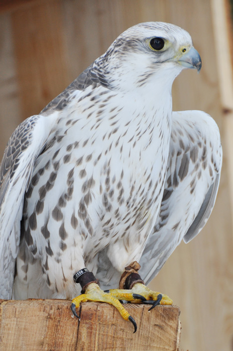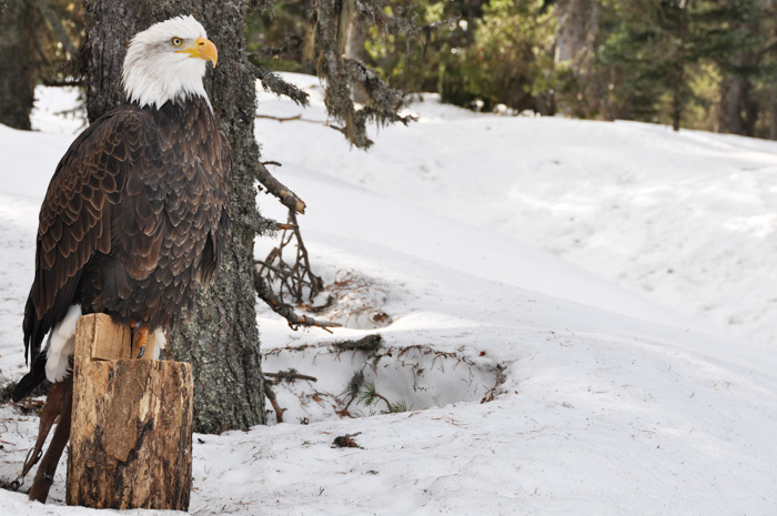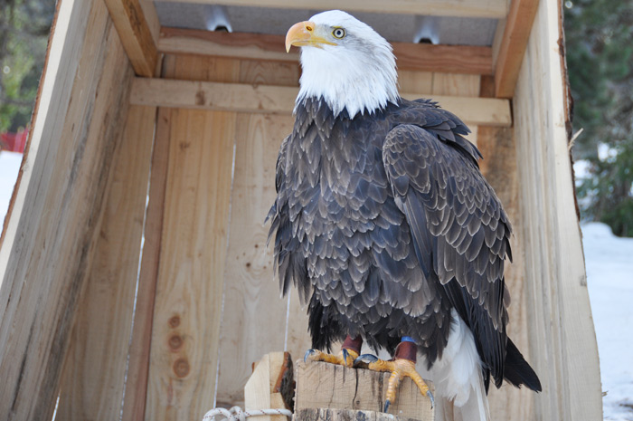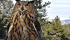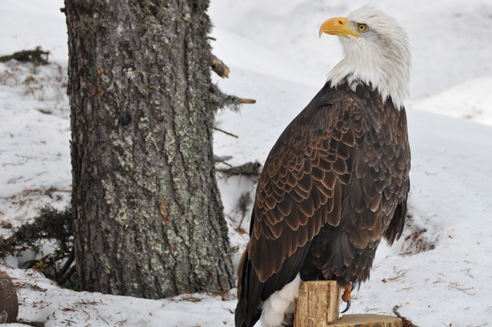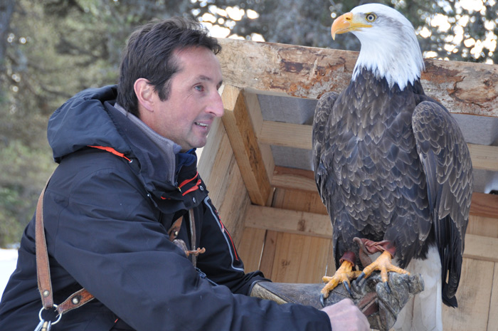 Symbole de puissance et de force le pygargue à tête blanche, emblème national des États-Unis, a été un temps menacé dans ce pays, au XXème siècle. Alaska est un spécimen de sept ans, il pèse 4,5 kg et mesure 2,40m d’envergure. Son port est majestueux et grâce au fauconnier on peut s’approcher pour le prendre en photo. Son bec impressionnant peut venir à bout d’une vache morte mais c’est de ses puissantes serres dont il faut le plus se méfier.