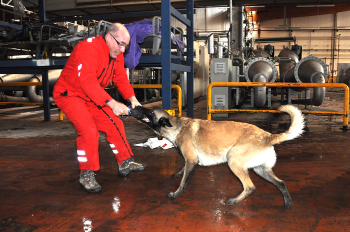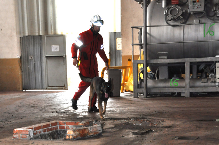 «Le secteur a été sécurisé par les autres équipes de secours (risques chimiques ou autre), le chien effectue sa recherche à l’avant de son maître, celui-ci analyse son comportement. Dès que le chien perçoit l’odeur de la personne dissimulée pour les besoins de l’exercice, il va remonter l’effluve et la fixer en aboyant jusqu’à ce que le maître vienne identifier ce qu’il a trouvé»