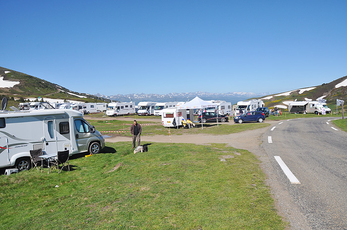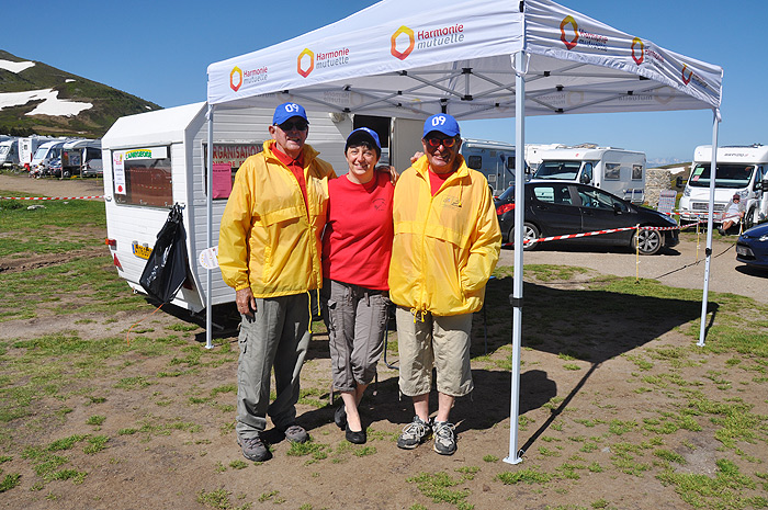 Tout au long de la montée vers le col, des espaces propreté régulièrement relevés, une fosse creusée pour les camping-cars, un commerçant ambulant qui apporte viennoiseries, journaux et fruits frais. Trois commerçants du village tiennent un stand: le boulanger, le restaurateur et le marchand de confiture. Et même un chapiteau pour des repas traiteur avec feu d’artifice!