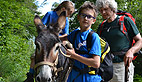 À plus de 1.100m d’altitude, Reyou et Jojo, deux ânes mis à disposition par un éleveur de chèvre du coin, conduisent nonchalamment Kadosa et sa nombreuse famille et offrent même leur dos aux plus jeunes d’entre les enfants. Leur arrivée ici est déjà une histoire en soi. Venus participer à une compétition d’aviron à Libourne cette famille belge, d’origine hongroise, a souhaité agrémenter son séjour d’une découverte de la montagne. Quelques clics suffisent pour les amener à choisir la prestation offerte par Oxalys.