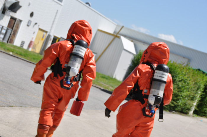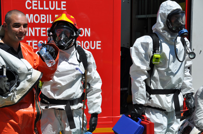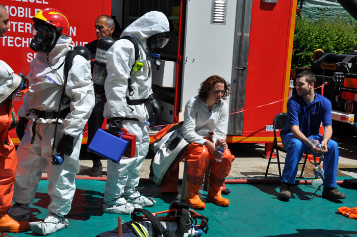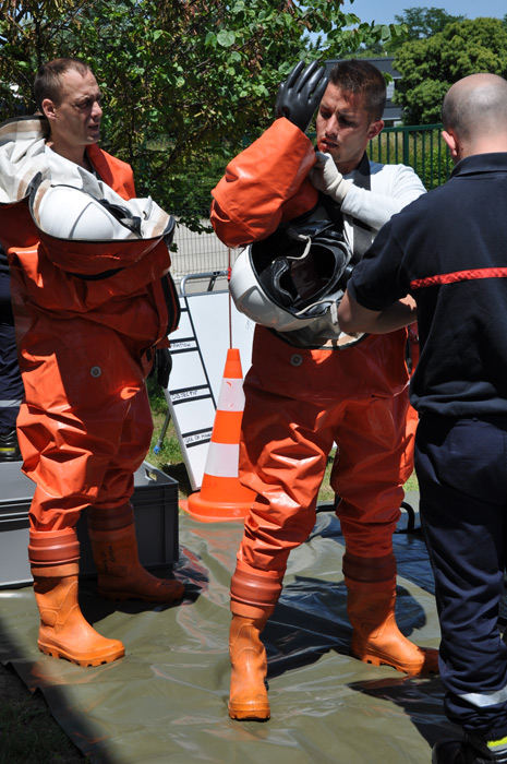 Les binômes se préparent à rentrer en zone contaminée et toxique: les équipiers essaient tant bien que mal d’enfiler de curieuses combinaisons spatiales. «Ce sont des scaphandres anti-gaz, ils pèsent sans les ARI plus d’une dizaine de kilos et à l’intérieur la température du corps peut monter jusqu’à 40 degrés d’où la nécessité de limiter les interventions dans le temps et de s’hydrater rapidement» indique un jeune pompier, «c’est un travail de prise en charge de la victime et d’obturation pour limiter voire supprimer la toxicité du site»