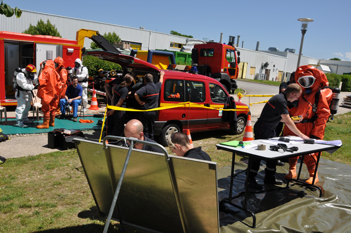 Un exercice visant à éprouver les savoir-faire des sapeurs-pompiersMaxime, du centre de secours de Pamiers distribue les rôles et les missions: mise en place d’une zone d’exclusion, périmètre de sécurité avec sas de décontamination.