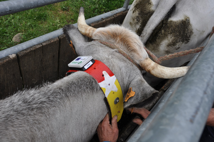 Et ce vendredi c’est en famille et avec l’assistance des voisins qu’elle a installé les sonnailles autour du cou de ses bêtes. Elle ne choisit pas l’animal en fonction de son leadership, elle prend ce qui vient, en prenant soin de relever systématiquement le numéro de la boucle d’oreille de la bête et le numéro de la balise. «Nous allons avoir une estive à la pointe de la technologie» ajoute son père dans un sourire.