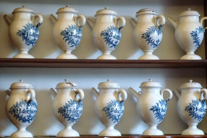 Dans la pharmacie, le regard se pose sur les noms très spéciaux de ces recettes. L’une des 69 bouteilles en verre est étiquetée «Vinaigre des quatre voleurs» Cette recette permit à quatre détrousseurs de victimes de la lèpre, de poursuivre leurs rapines sans tomber malade. En échange de la composition de leur lotion, les voleurs obtinrent la vie sauve.