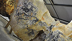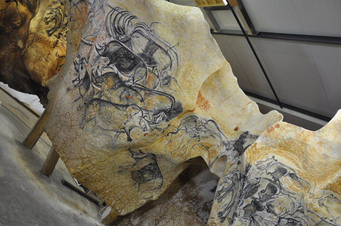 Gilles Tosello allie talent artistique et rigueur scientifique. Il travaille à partir de fichiers 3D projetés sur les moulages, de photos et des techniques employées par les hommes préhistoriques: «l’homo sapiens avait des techniques très élaborées, il savait exprimer le mouvement, la perspective, il utilisait le relief de la paroi pour donner vie et volume à leurs représentations. Le choix le plus simple était d’utiliser les mêmes outils : il s’agissait de dessin au fusain et estampe. Nous avons utilisé du charbon de bois et pour le pigment de la roche des pigments naturels (encre rouge, terre de Sienne)…le fusain donne un côté à la fois charbonneux et fragile qu’il faut transcrire sur la paroi (nous avons fait beaucoup d’essais sur la résine). Ici à Chauvet la superposition des animaux est déroutante, il y a une construction par étage qui donne ce côté de prolifération un peu comme certaines fresques égyptiennes. Je me suis replacé dans la position du chercheur pour rétablir la chronologie des évènements et dérouler ce fil d’Ariane»