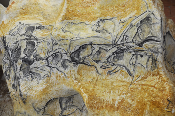 Plus de 400 lions, chevaux, bisons, cerfs, mammouths courent sur ces parois et hantent jour et nuit depuis le mois de mars la vie de Gilles Tosello qui y voit un formidable travail de fin d’étude. «Après avoir travaillé aussi longtemps sur la grotte, me demander d’en réaliser un fac-similé, restituer au plus proche les parois et les dessins, c’est ce qui pouvait m’arriver de mieux.