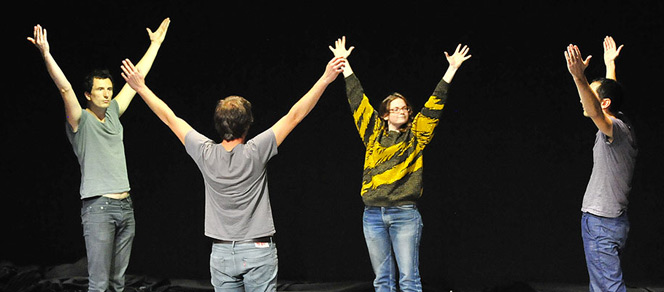 Le Germinal d’Antoine Defoort et Halory Goerger n’a rien à voir avec celui d’Emile Zola. Trois murs, une scène surélevée et le noir absolu d’où vont naitre de la lumière quatre entités. Quatre humains qui vont vite se rendre compte que leurs pensées s’affichent sur des panneaux lumineux. Ils ont des prénoms, Arnaud, Béatriz, Sébastien et Denis.
