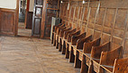 La pharmacie, le réfectoire sont restés figés depuis les années 50, mais c’est incontestablement dans la salle capitulaire que l’on touche du doigt la réalité du carmel avec cette épaisse grille séparant, protégeant les sœurs de la chapelle accessible aux fidèles de l’extérieur.