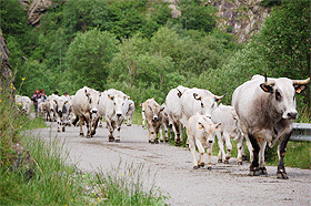 Sur plus de six kilomètres les troupeaux et les touristes, souvent venus de loin, ont rejoint les locaux venus perpétuer la tradition de la montée aux estives.