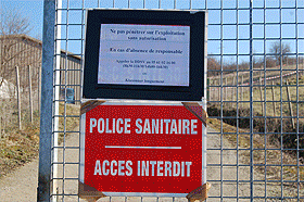 Rendez-vous point presse à 15h, après avoir franchi plusieurs barrages (gendarmerie et sapeurs-pompiers), devant l’élevage de M. Falcou. Les grilles sont fermées, un arrêté préfectoral en interdit. Les responsables de l’exercice nous y retrouvent.