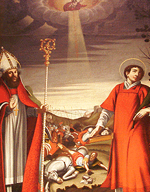 Les deux toiles restaurées datent vraisemblablement du XVIIIe siècle, elles ont été placées dans l’église en 1752 et font partie d’un ensemble dont il ne reste plus désormais que cinq éléments. Sur le premier tableau deux personnages au premier plan: celui de gauche est Saint Martin, représenté en prélat avec mitre et crosse, celui de droite Saint Laurent avec la dalmatique du diacre et la palme du martyre.