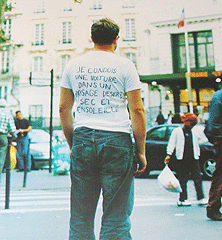 Sur l’une d’entre elles on peut voir un homme de dos, vêtu d’un tee-shirt et d’un jean avec en guise de légende de texte de Jean Beaudrillard: «Je conduis une voiture dans un paysage désert sec et ensoleillé»