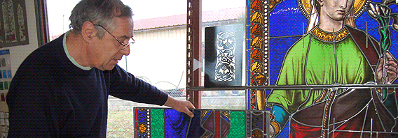 «Un des principes de la restauration, explique Pierre Rivière, c’est de garder l’authenticité du vitrail… cependant quand il manque un morceau trop important, il m’arrive de réaliser une pièce afin de remplacer les manques, elle est fixée aux autres avec des clous de montage en suivant le modèle (réalisé sur calque), les lignes d’intersections sont soudées à l’étain avant de mastiquer le tout…